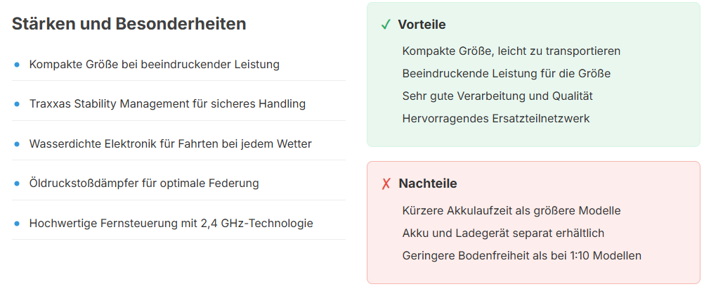 Der Traxxas Mini XRT ist die perfekte Wahl für RC-Enthusiasten, die ein kompaktes, aber dennoch leistungsstarkes Modell suchen. Seine geringe Größe macht ihn ideal für Fahrer mit begrenztem Platzangebot oder für diejenigen, die ihr RC-Car gerne auf Reisen mitnehmen möchten. Dank des Stability Management Systems eignet er sich auch hervorragend für Einsteiger, die ein qualitativ hochwertiges Modell suchen, das mit ihnen "mitwachsen" kann.