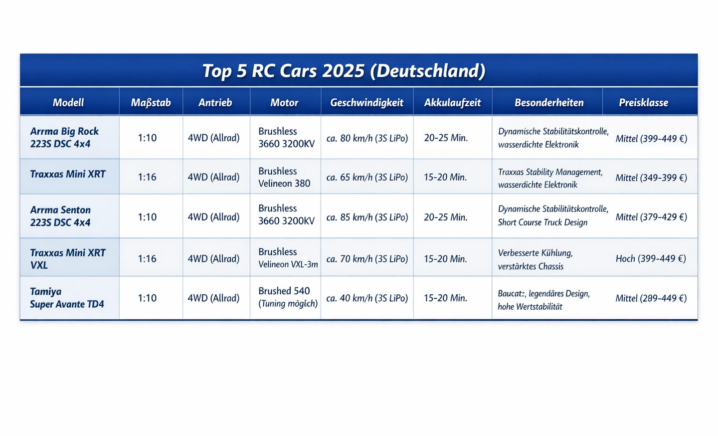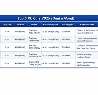 Bevor wir in die Details jedes Modells eintauchen, verschaffen wir Ihnen einen schnellen Überblick über die wichtigsten technischen Daten und Eigenschaften der fünf getesteten RC-Cars. Die folgende Tabelle hilft Ihnen, die Modelle auf einen Blick zu vergleichen und die für Sie relevanten Faktoren zu identifizieren.