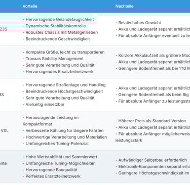 Nachdem wir Ihnen die fünf Modelle im Detail vorgestellt haben, möchten wir nun einen direkten Vergleich in verschiedenen Kategorien ziehen. Dies soll Ihnen helfen, das für Ihre Bedürfnisse optimale RC-Car zu finden.