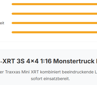 Für wen ist der Traxxas Mini XRT VXL ideal?Der Traxxas Mini XRT VXL ist die perfekte Wahl für erfahrene RC-Piloten, die maximale Leistung in einem kompakten Format suchen. Seine überragende Power und Beschleunigung machen ihn zum idealen Begleiter für anspruchsvolle Offroad-Strecken und spektakuläre Sprünge. Trotz seiner kompakten Größe steht er größeren Modellen in Sachen Leistung und Robustheit in nichts nach und bietet zudem den Vorteil der besseren Transportierbarkeit.